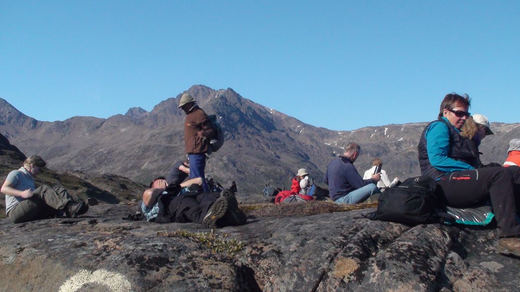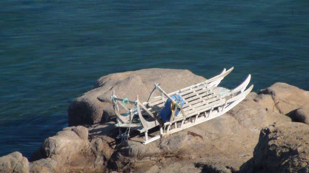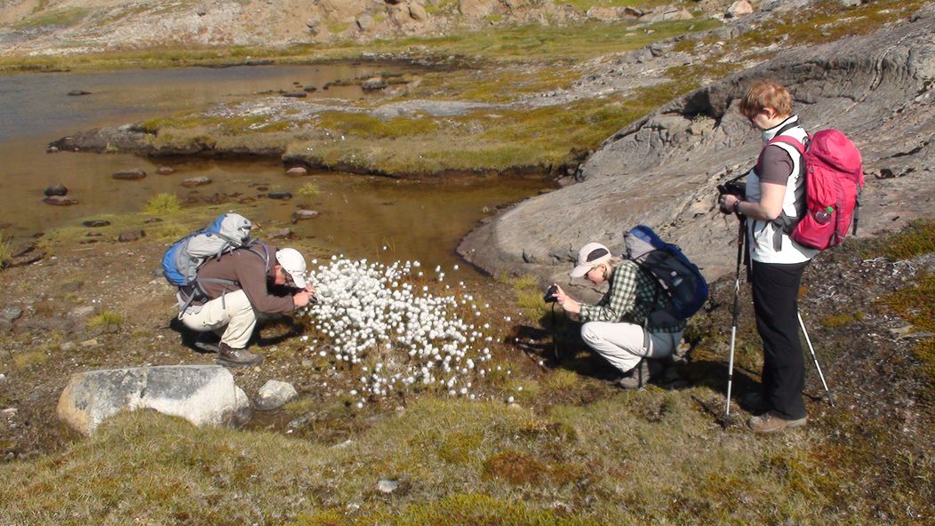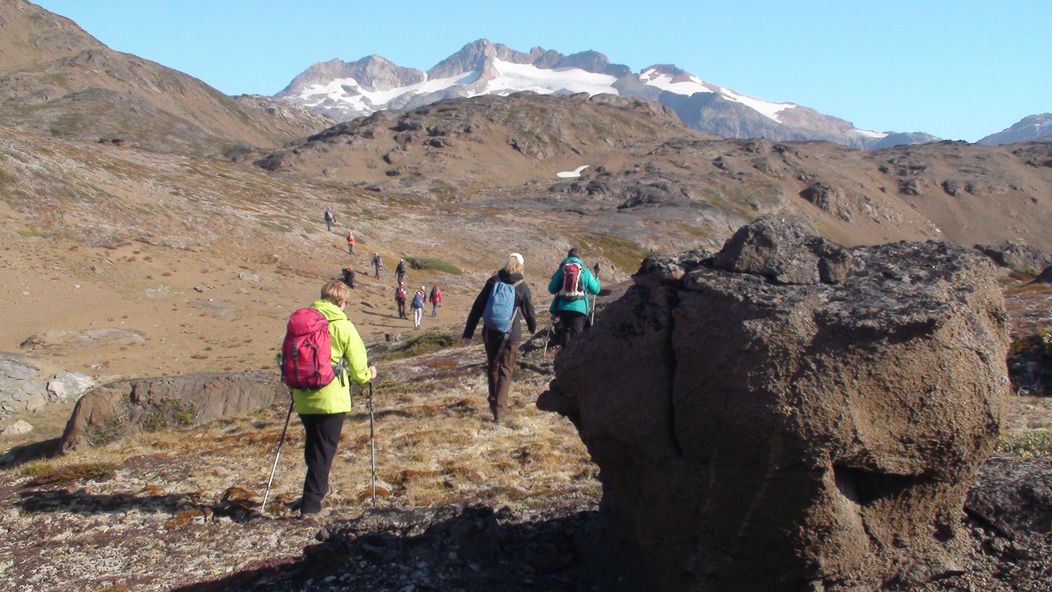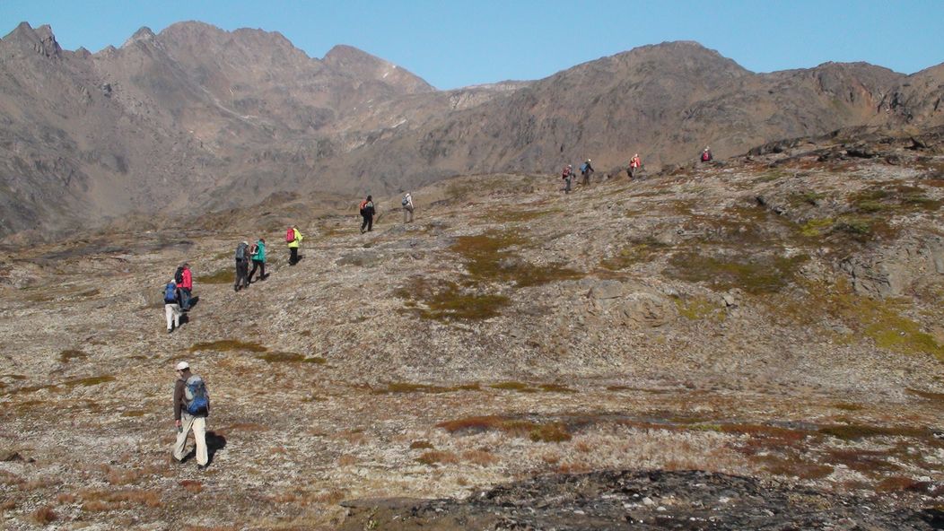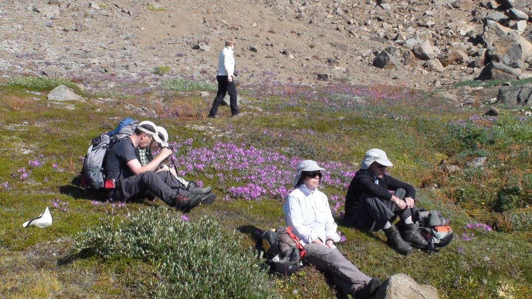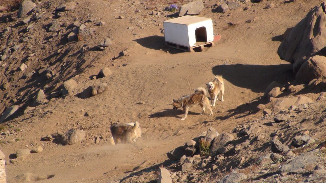 Nach dem Frühstück geht es mit dem Boot auf die andere Seite der Bucht. Dort startet unsere Tageswanderung. Unterwegs sehen wir eine karge Landschaft, so dass jede Blume das Auge erfreut. Im Ort angekommen, gehen wir zuerst an den angeketteten Schlittenhunden vorbei. Die erwachsenen Hunde dürfen nicht frei herumlaufen und werden regelrecht vor dem Dorf kaserniert. Lediglich die jungen Schlittenhunde dürfen sich im Dorf frei bewegen.