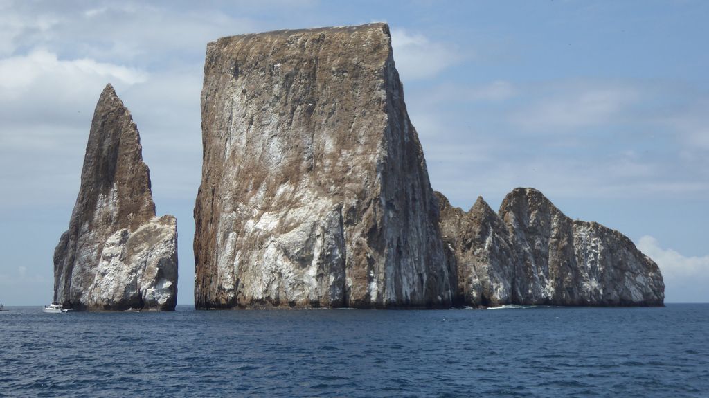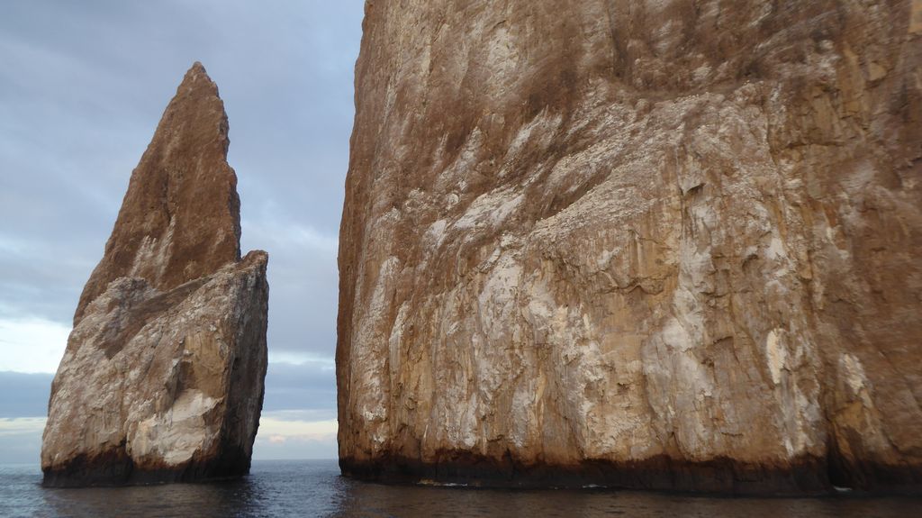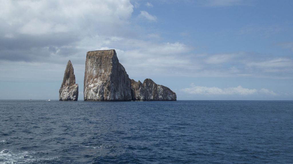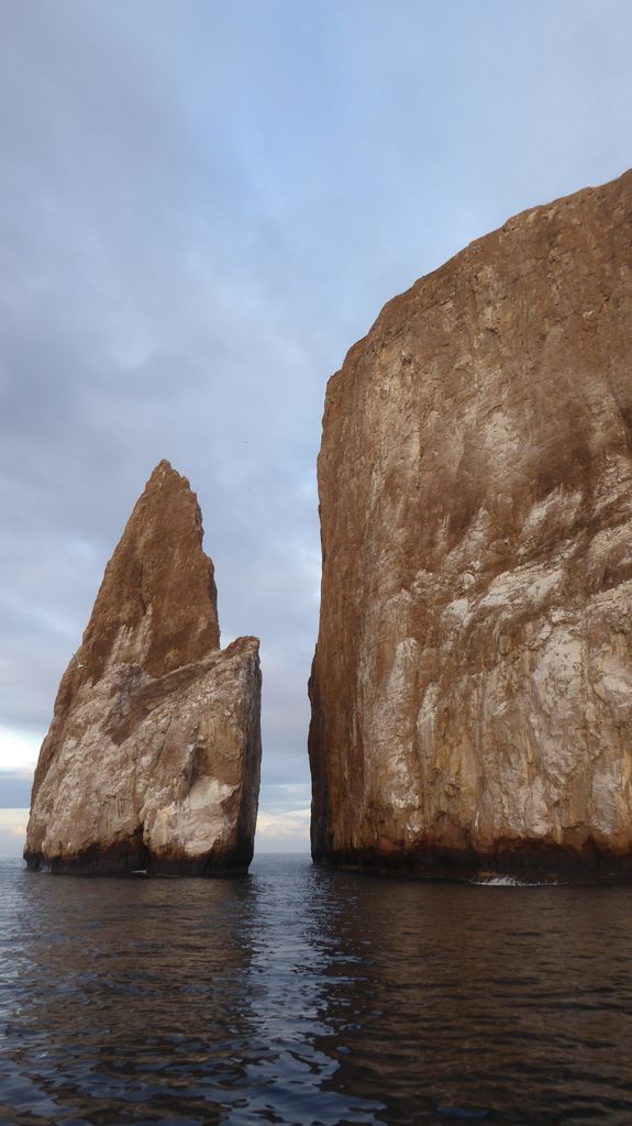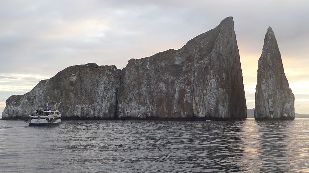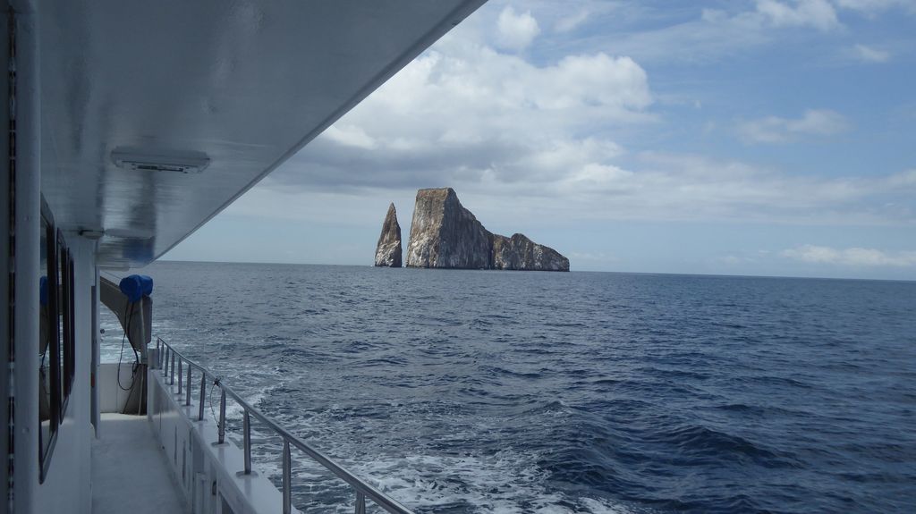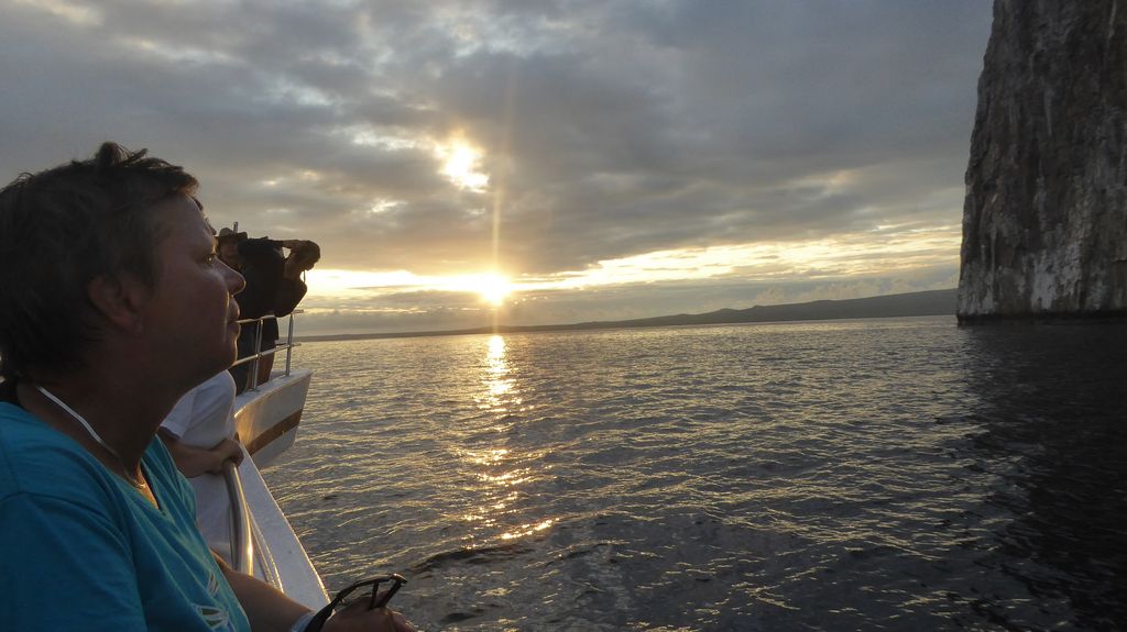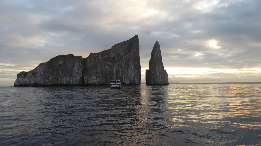 Für die Ankerstellen haben die Schiffe Zeitslots erhalten, an die sie sich halten müssen. Es wird daher manchmal an anderen Stellen zwischengeankert, um später das Ziel anzufahren. Bereits gegen 4 Uhr nahm unser Schiff die Fahrt wieder auf, um kurz nach 6 Uhr am Kicker Rock anzukommen. Nach einer Umrundung des Felsens beim Sonnenaufgang ging es noch vor dem Frühstück ins Wasser zum Schnorcheln. Getrieben durch die Dünnung trieb man in Begleitung von Fischen und Meeresschildkröten quer durch die für die Schiffsfahrt (und auch für Schlauchboote) gesperrte Passage zwischen zwei steilen Felsen.