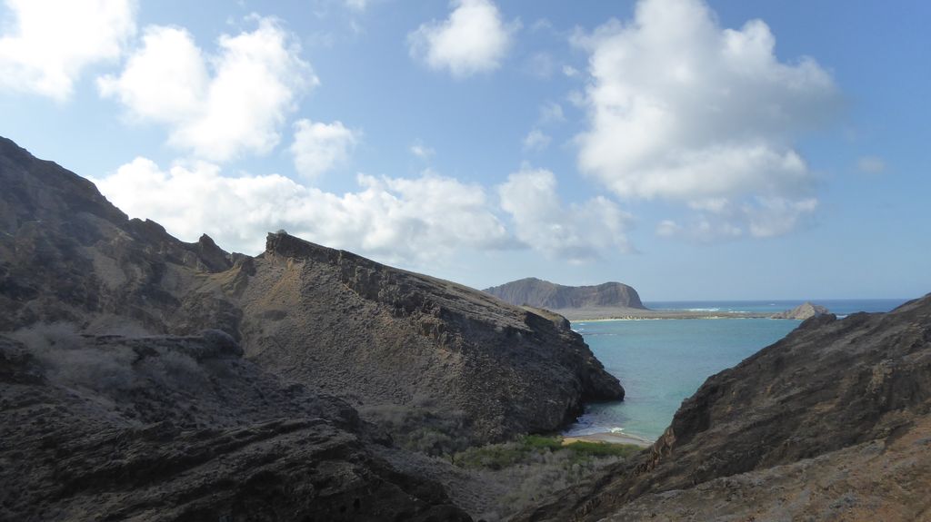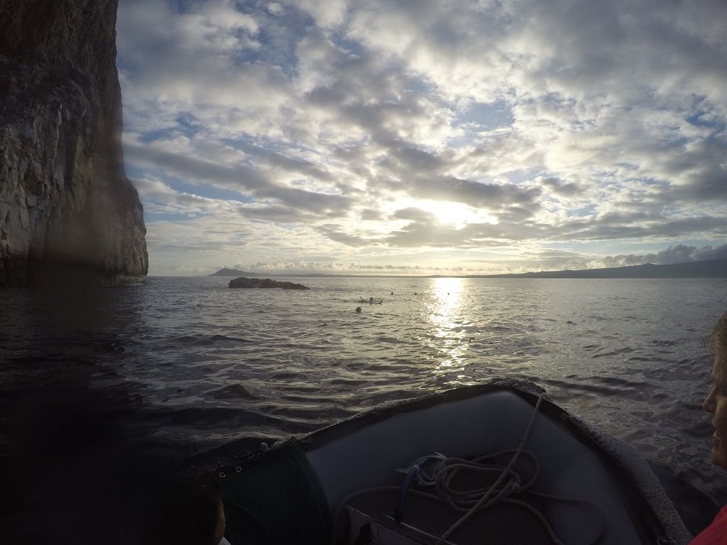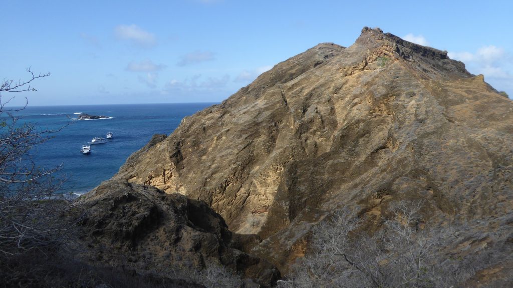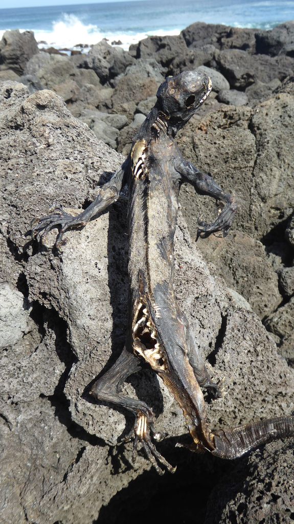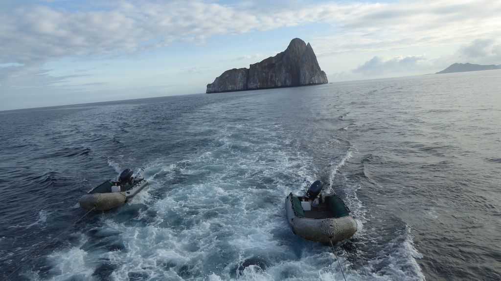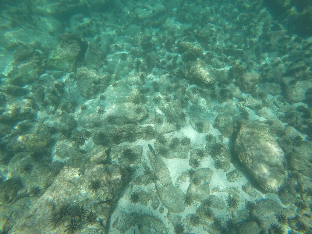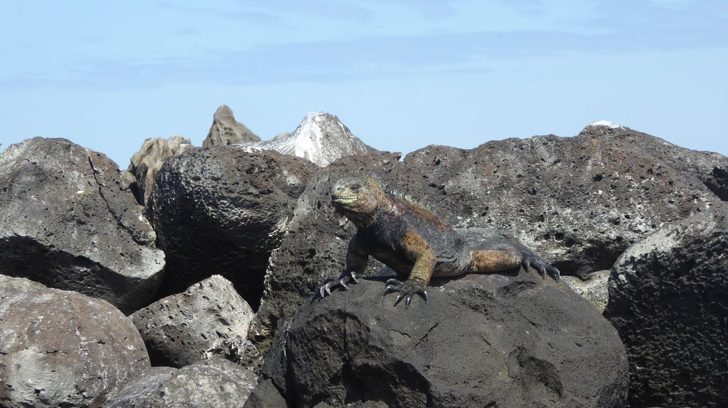 Für die Ankerstellen haben die Schiffe Zeitslots erhalten, an die sie sich halten müssen. Es wird daher manchmal an anderen Stellen zwischengeankert, um später das Ziel anzufahren. Bereits gegen 4 Uhr nahm unser Schiff die Fahrt wieder auf, um kurz nach 6 Uhr am Kicker Rock anzukommen. Nach einer Umrundung des Felsens beim Sonnenaufgang ging es noch vor dem Frühstück ins Wasser zum Schnorcheln. Getrieben durch die Dünnung trieb man in Begleitung von Fischen und Meeresschildkröten quer durch die für die Schiffsfahrt (und auch für Schlauchboote) gesperrte Passage zwischen zwei steilen Felsen.