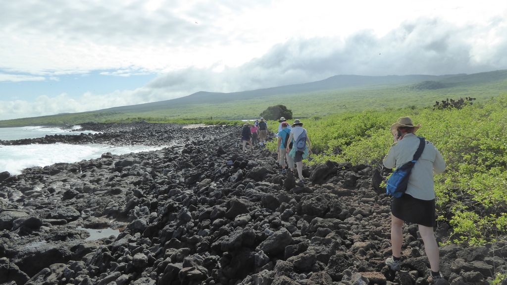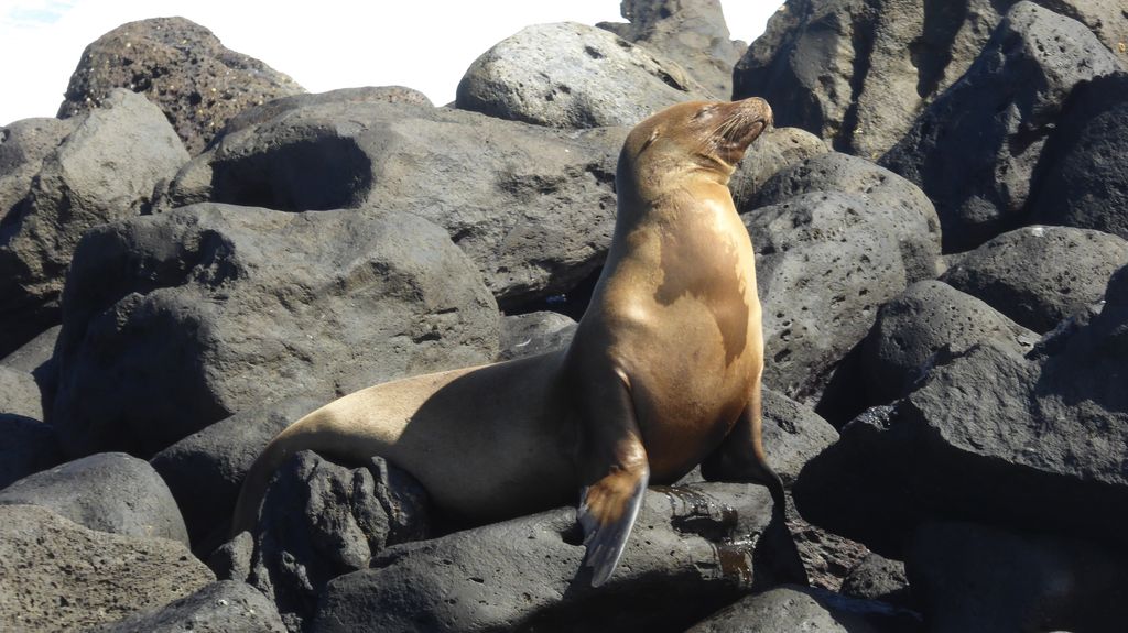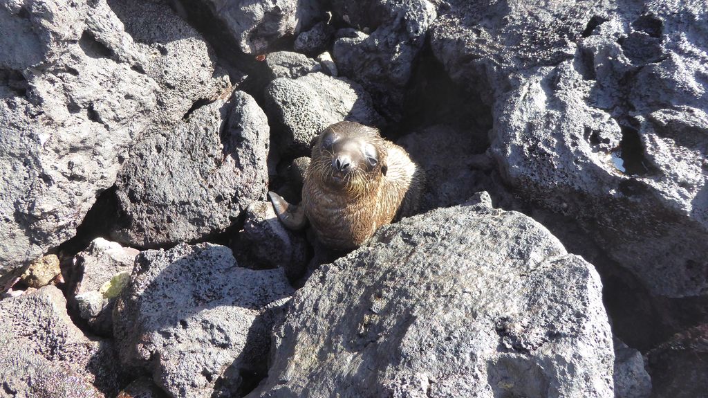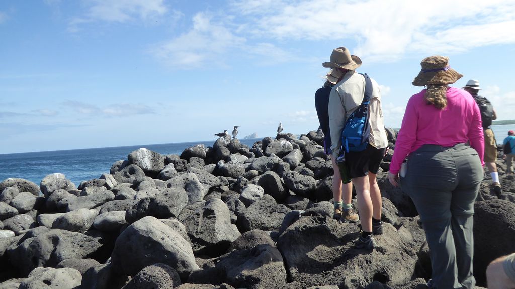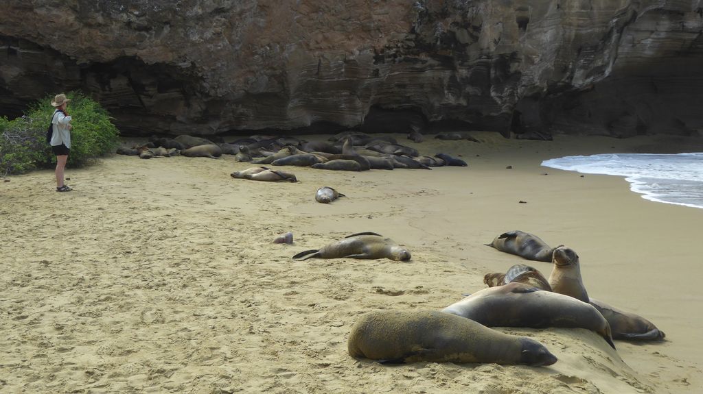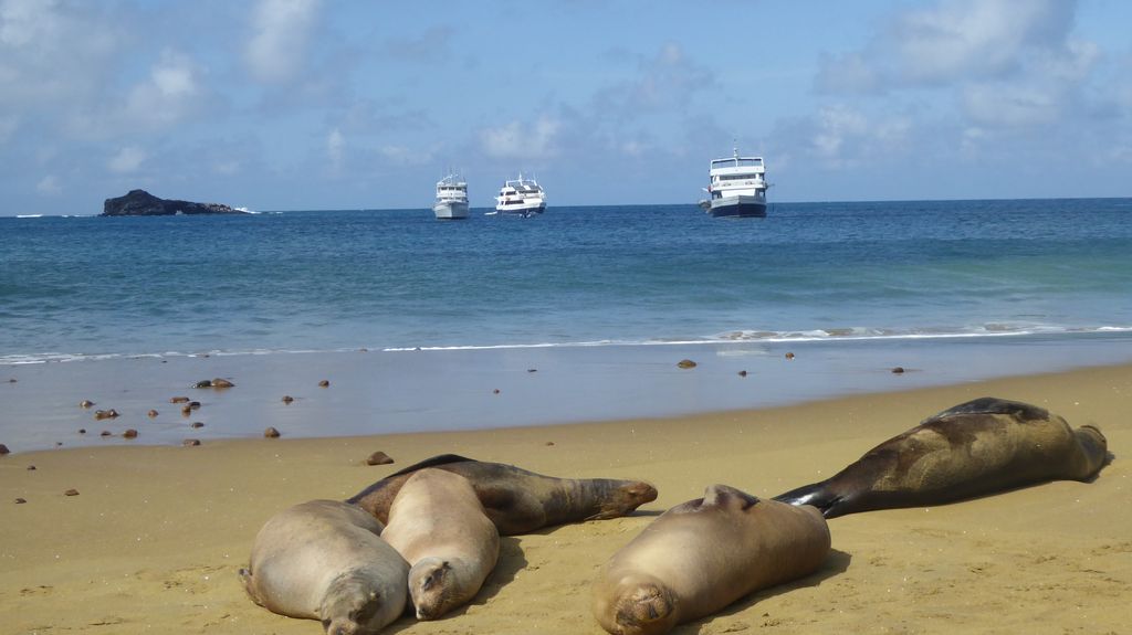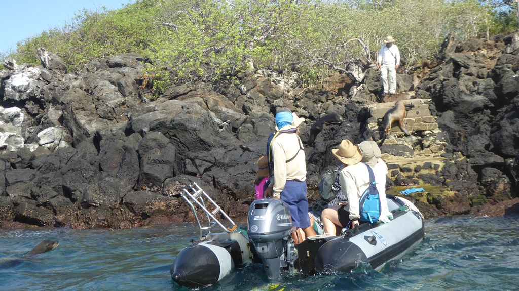 Insgesamt waren auf dem Schiff 12 Passagiere, neben uns nur noch Amerikaner, so dass Englisch und nicht das landesübliche Spanisch gesprochen wurde. Bei den Aktivitäten wurden die Passagiere auf zwei Dingi‘s verteilt. Bei der hohen Welle in der Bucht bei Punta Pitt hat die Besatzung des anderen Beiboots erleben können, was unter „Wet Landing“ zu verstehen ist. Die Welle schwappte in das Beiboot. Die Seelöwen am Strand hat es überhaupt nicht gestört. Nach der Wanderung entlang der mit weißen Pflöcken abgesteckten Pfade blieb noch etwas Zeit um den Seelöwen am Strand zuzuschauen. Das Ablegemanöver der Dingi’s klappte diesmal reibungslos. Direkt nach der Ankunft am Schiff wurde der Anker gelichtet und das Schiff nahm Fahrt in Richtung Isla Santa Fe auf.