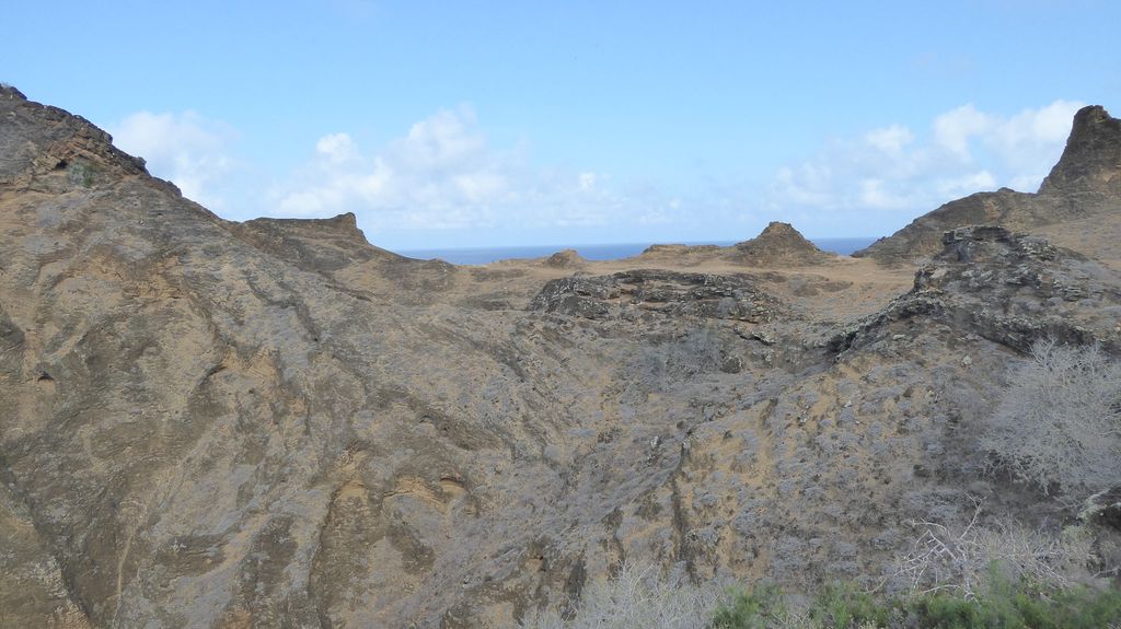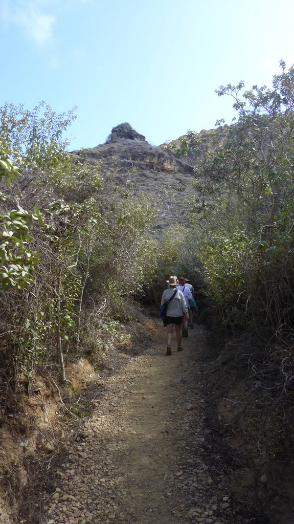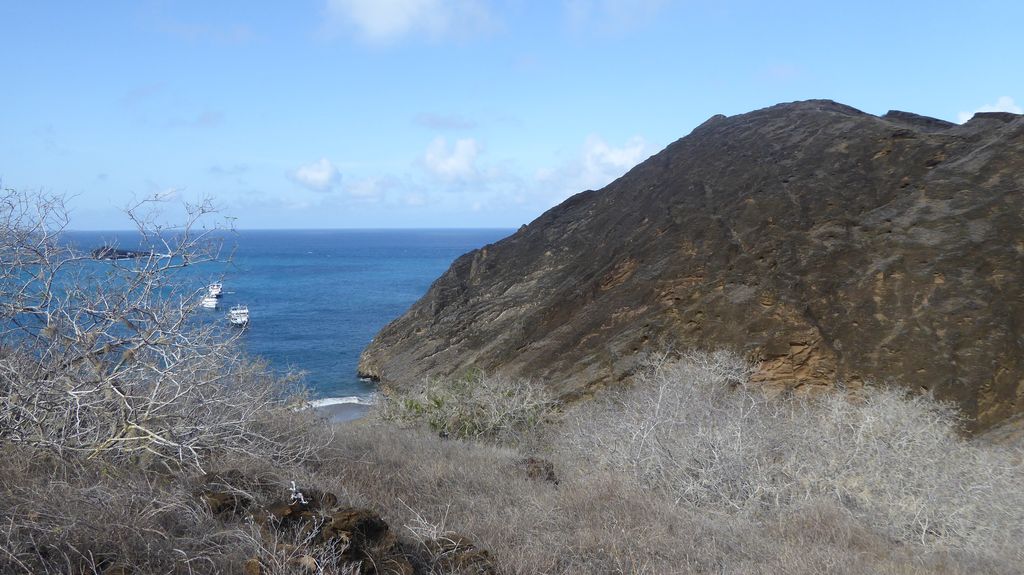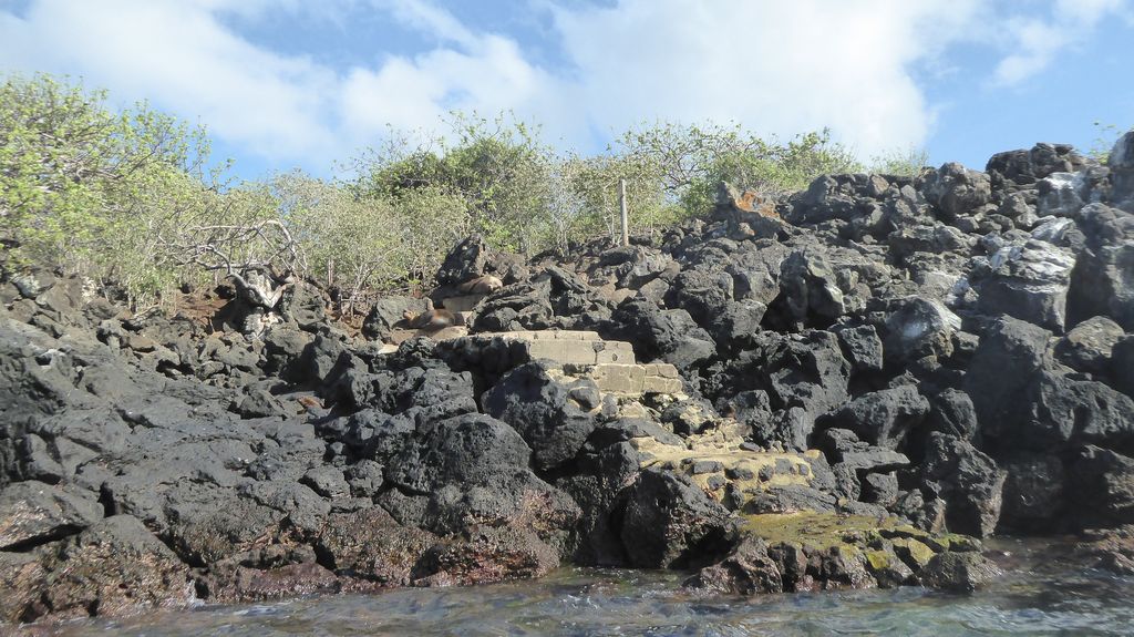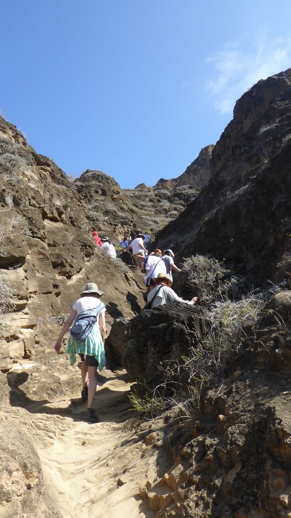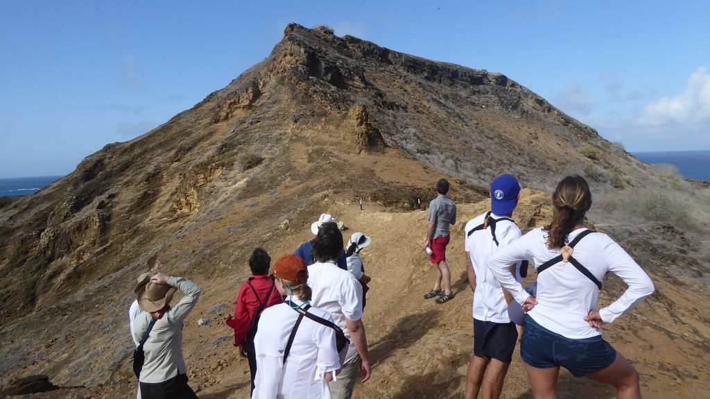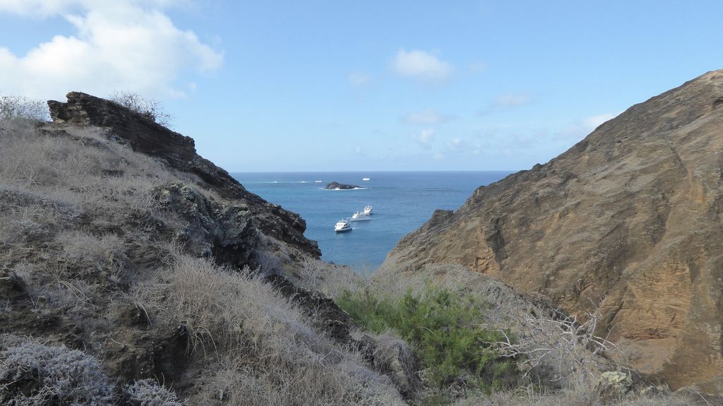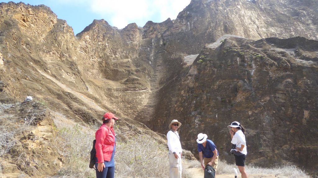 Insgesamt waren auf dem Schiff 12 Passagiere, neben uns nur noch Amerikaner, so dass Englisch und nicht das landesübliche Spanisch gesprochen wurde. Bei den Aktivitäten wurden die Passagiere auf zwei Dingi‘s verteilt. Bei der hohen Welle in der Bucht bei Punta Pitt hat die Besatzung des anderen Beiboots erleben können, was unter „Wet Landing“ zu verstehen ist. Die Welle schwappte in das Beiboot. Die Seelöwen am Strand hat es überhaupt nicht gestört. Nach der Wanderung entlang der mit weißen Pflöcken abgesteckten Pfade blieb noch etwas Zeit um den Seelöwen am Strand zuzuschauen. Das Ablegemanöver der Dingi’s klappte diesmal reibungslos. Direkt nach der Ankunft am Schiff wurde der Anker gelichtet und das Schiff nahm Fahrt in Richtung Isla Santa Fe auf.