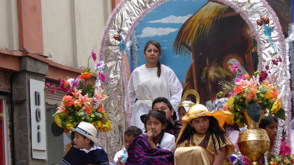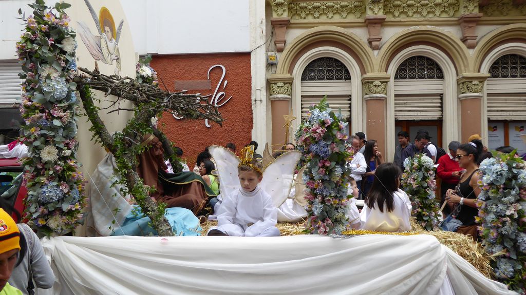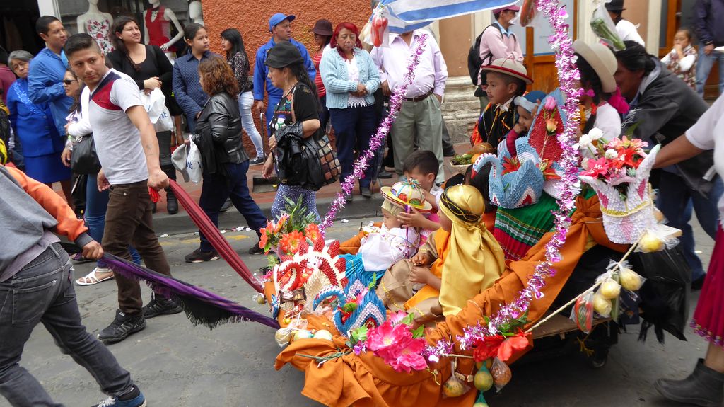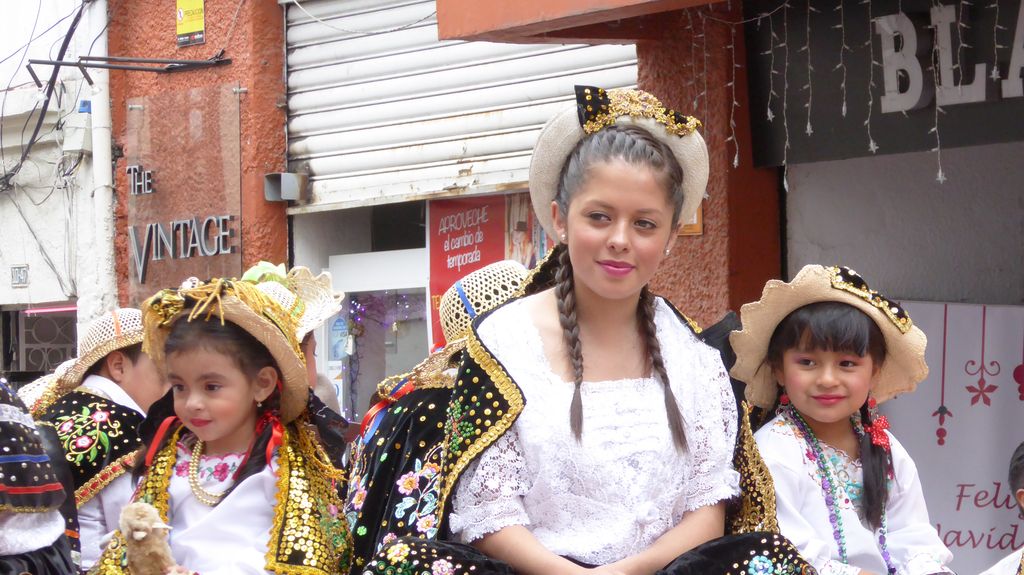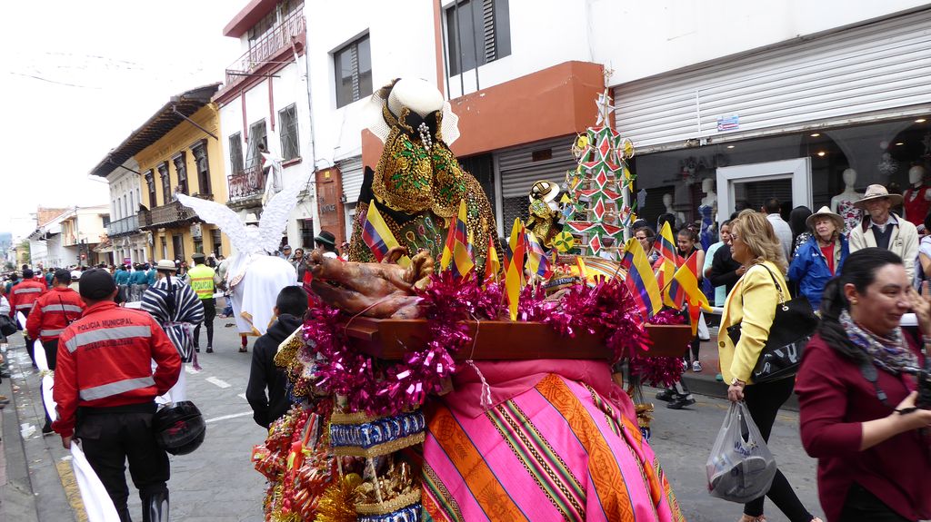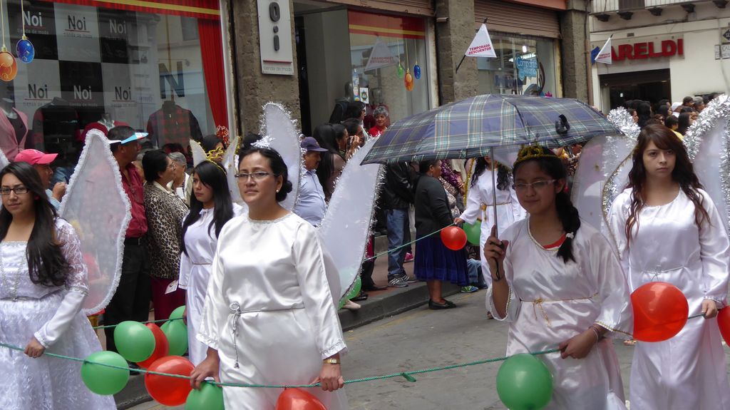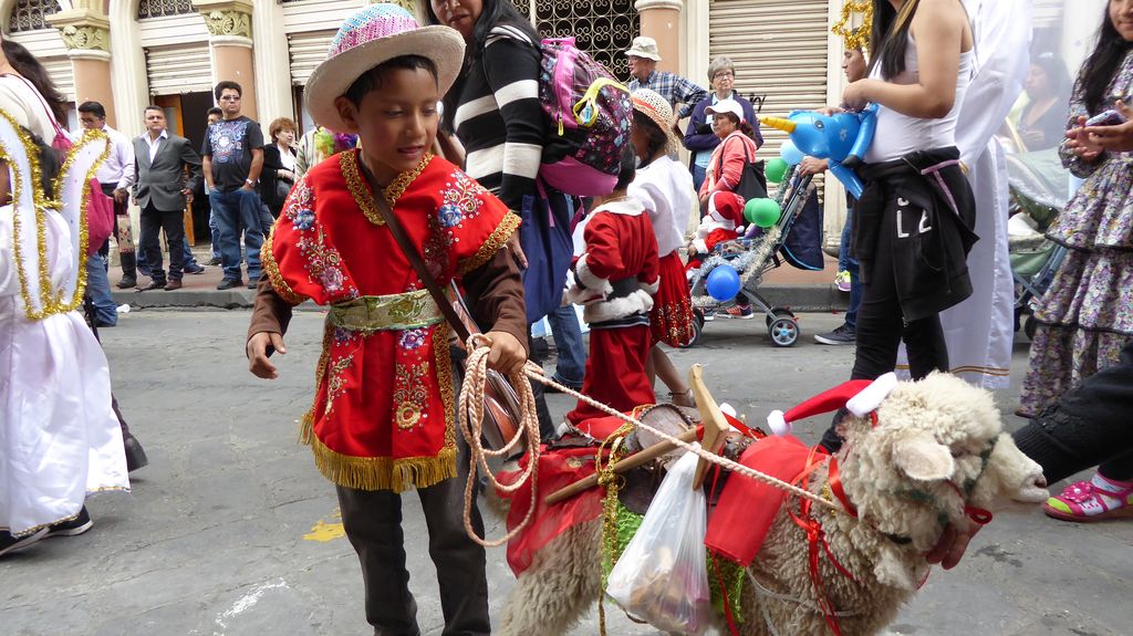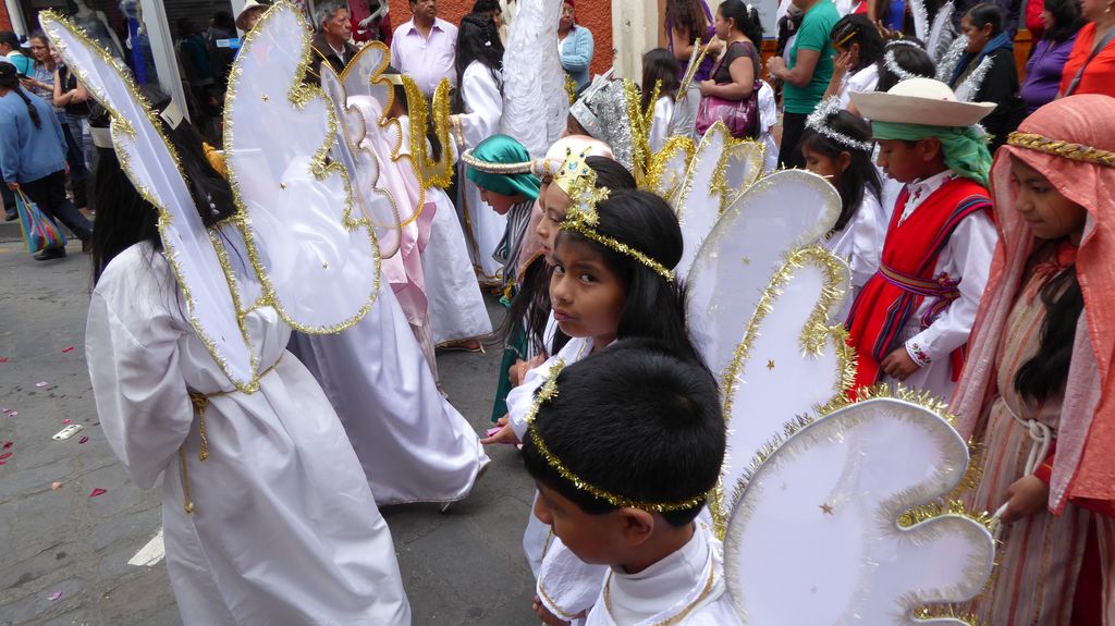 Am Heiligabend findet in Cuenca alljährlich der Umzug „Pase del Niño“ statt. Dies haben wir uns nicht entgehen lassen. Der Umzug begann um 9 Uhr und dauerte bis ca. 15 Uhr. Um das Ganze bei schönem sonnigen Wetter zu meistern, haben wir zu Hilfsmitteln gegriffen. Bei einer Straßenverkäuferin haben wir für 2 Dollar einen Plastikhocker erworben, auf dem Eva die ganzen sechs Stunden ausharren konnte. Zwischendurch haben wir kleine Standortwechsel vollzogen, um bessere Sicht auf den Umzug zu haben. Der Umzug lief chaotisch ab, eine Struktur war jedenfalls in meinen Augen nicht erkennbar. Neben organisierten Gruppen lief auch die halbe Stadt mit. Verkleidet als Engel und Superhelden säumten ganze Familien mit Kindern und Großeltern die Straßen. Auch kostümierte Hunde liefen im Zug mit. Am frühen Nachmittag haben einige Gruppen aufgrund der mehrstündigen Dauer das Corso vorzeitig verlasen. Der Umzug in Riobamba hat mir mehr zugesagt.