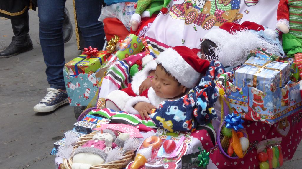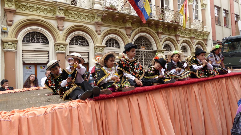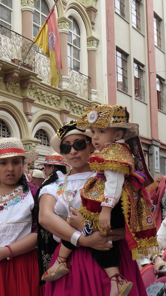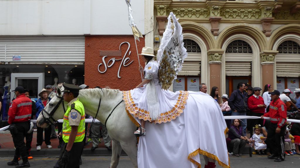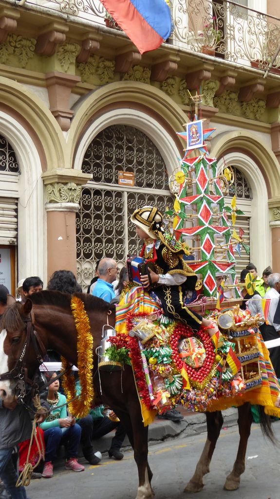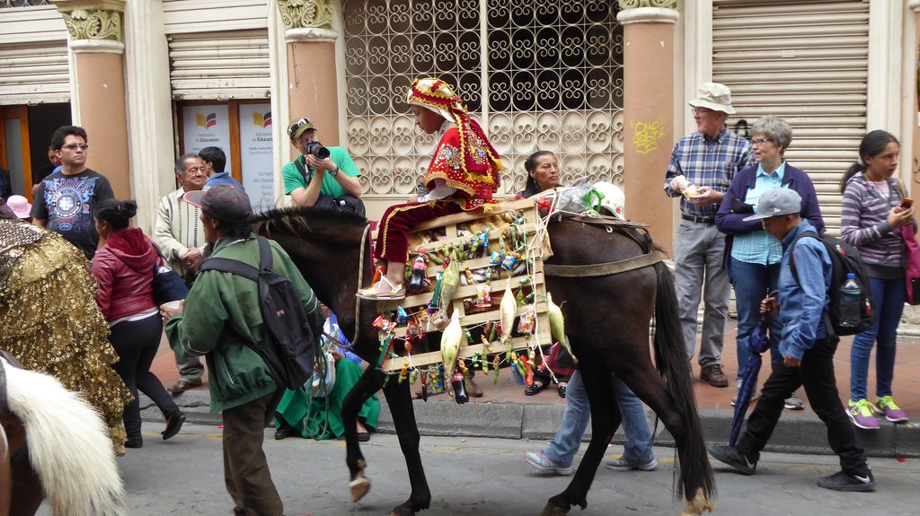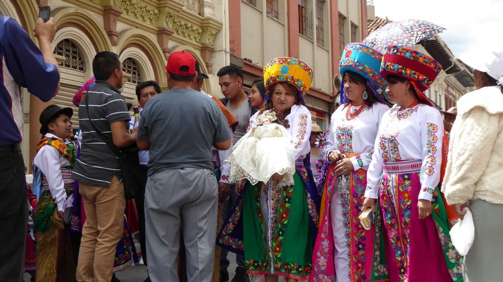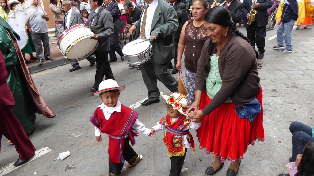 Am Heiligabend findet in Cuenca alljährlich der Umzug „Pase del Niño“ statt. Dies haben wir uns nicht entgehen lassen. Der Umzug begann um 9 Uhr und dauerte bis ca. 15 Uhr. Um das Ganze bei schönem sonnigen Wetter zu meistern, haben wir zu Hilfsmitteln gegriffen. Bei einer Straßenverkäuferin haben wir für 2 Dollar einen Plastikhocker erworben, auf dem Eva die ganzen sechs Stunden ausharren konnte. Zwischendurch haben wir kleine Standortwechsel vollzogen, um bessere Sicht auf den Umzug zu haben. Der Umzug lief chaotisch ab, eine Struktur war jedenfalls in meinen Augen nicht erkennbar. Neben organisierten Gruppen lief auch die halbe Stadt mit. Verkleidet als Engel und Superhelden säumten ganze Familien mit Kindern und Großeltern die Straßen. Auch kostümierte Hunde liefen im Zug mit. Am frühen Nachmittag haben einige Gruppen aufgrund der mehrstündigen Dauer das Corso vorzeitig verlasen. Der Umzug in Riobamba hat mir mehr zugesagt.