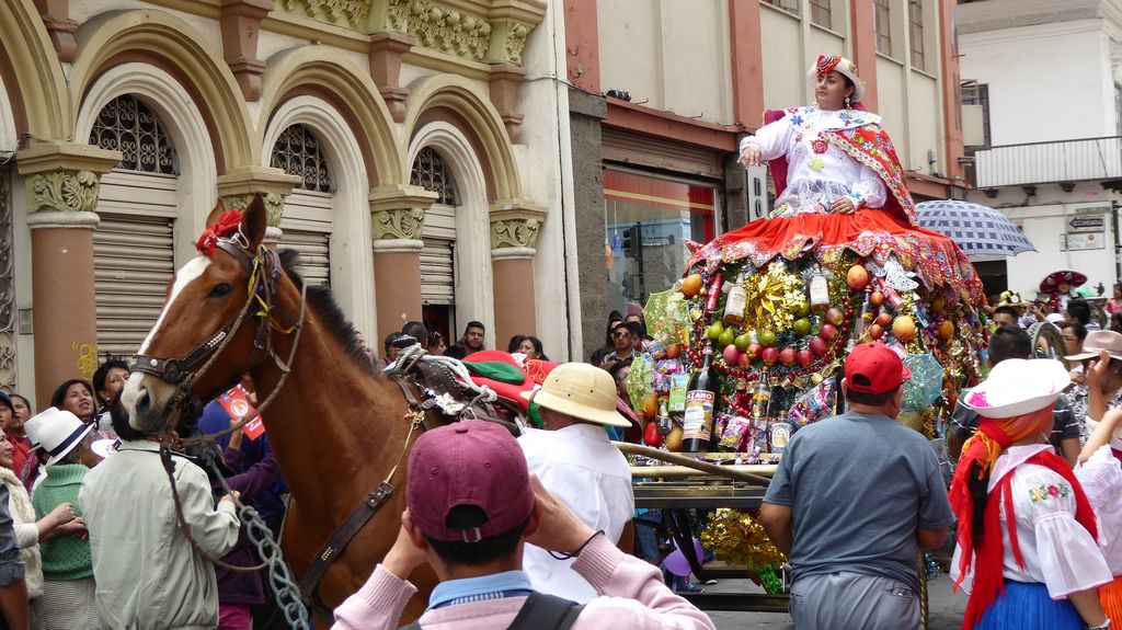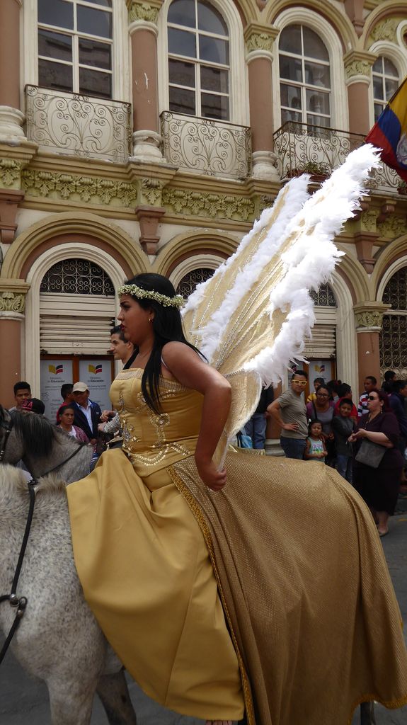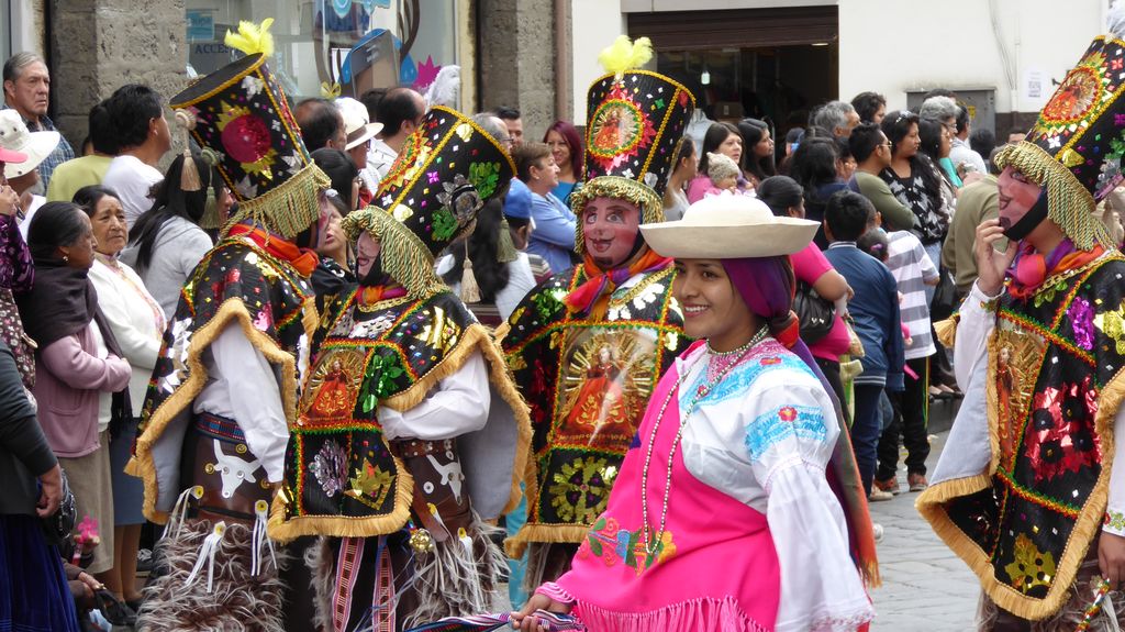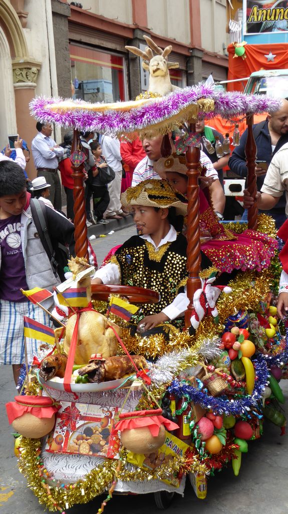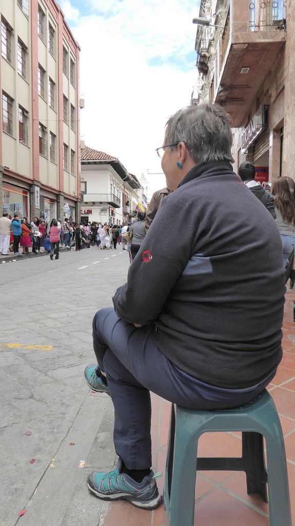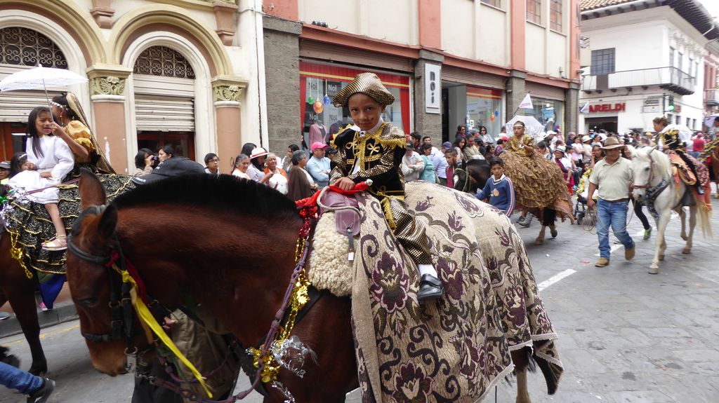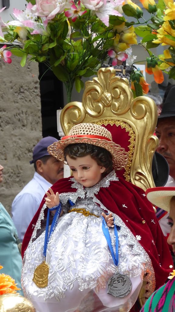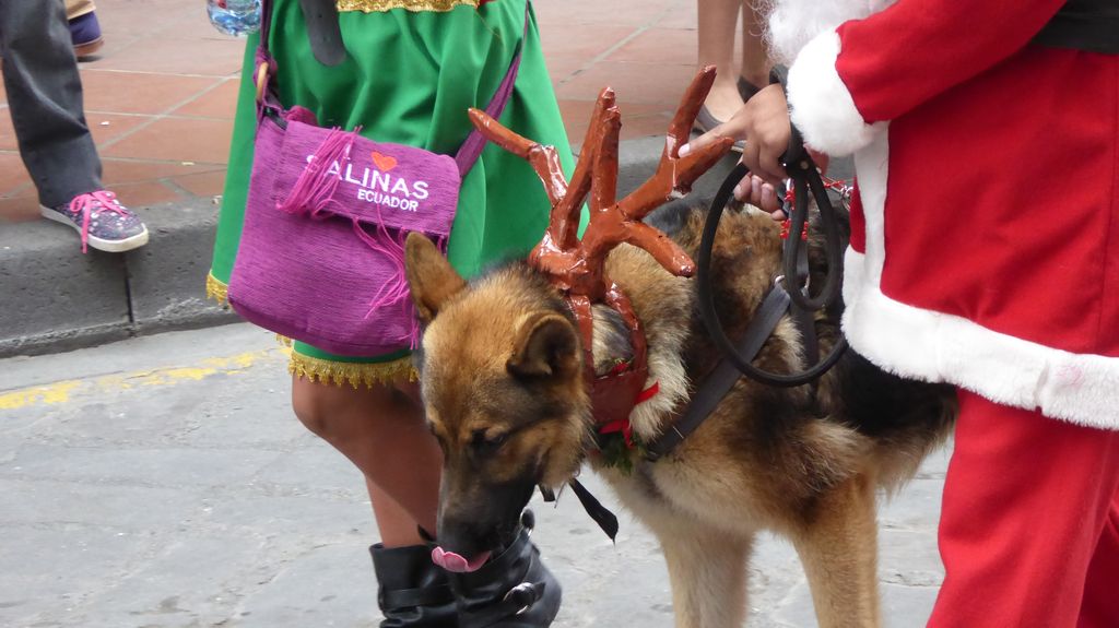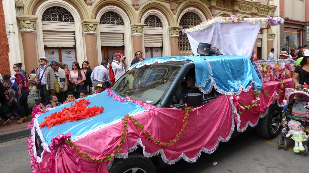 Am Heiligabend findet in Cuenca alljährlich der Umzug „Pase del Niño“ statt. Dies haben wir uns nicht entgehen lassen. Der Umzug begann um 9 Uhr und dauerte bis ca. 15 Uhr. Um das Ganze bei schönem sonnigen Wetter zu meistern, haben wir zu Hilfsmitteln gegriffen. Bei einer Straßenverkäuferin haben wir für 2 Dollar einen Plastikhocker erworben, auf dem Eva die ganzen sechs Stunden ausharren konnte. Zwischendurch haben wir kleine Standortwechsel vollzogen, um bessere Sicht auf den Umzug zu haben. Der Umzug lief chaotisch ab, eine Struktur war jedenfalls in meinen Augen nicht erkennbar. Neben organisierten Gruppen lief auch die halbe Stadt mit. Verkleidet als Engel und Superhelden säumten ganze Familien mit Kindern und Großeltern die Straßen. Auch kostümierte Hunde liefen im Zug mit. Am frühen Nachmittag haben einige Gruppen aufgrund der mehrstündigen Dauer das Corso vorzeitig verlasen. Der Umzug in Riobamba hat mir mehr zugesagt.